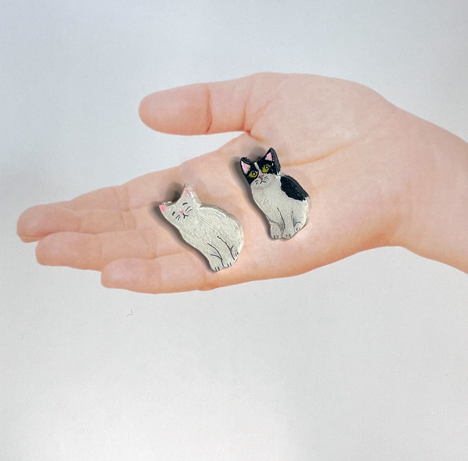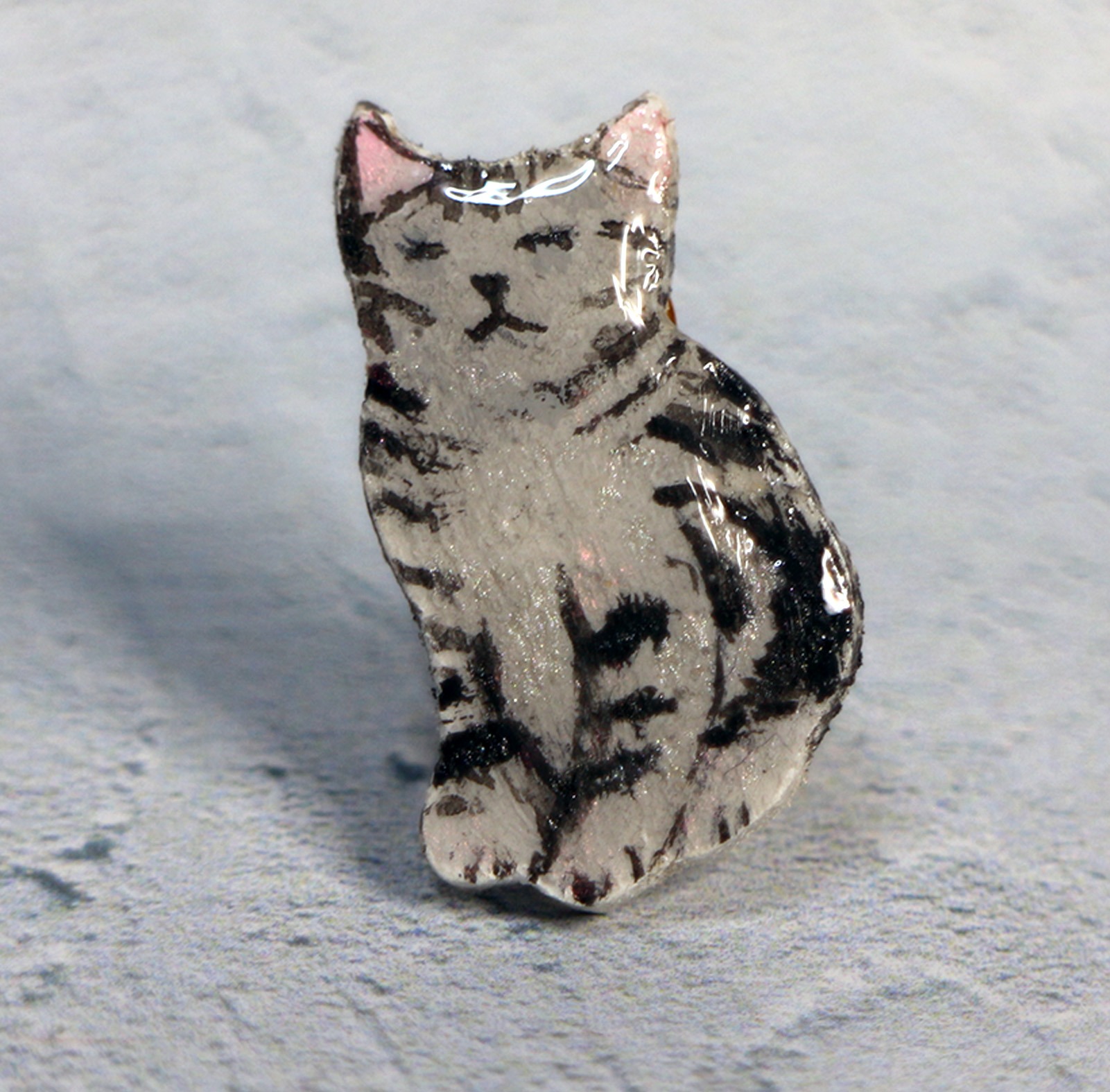 手のひらに乗せても、重量はわずか0.5gの木の猫ブローチです。表はレジンでコーティングしてます。