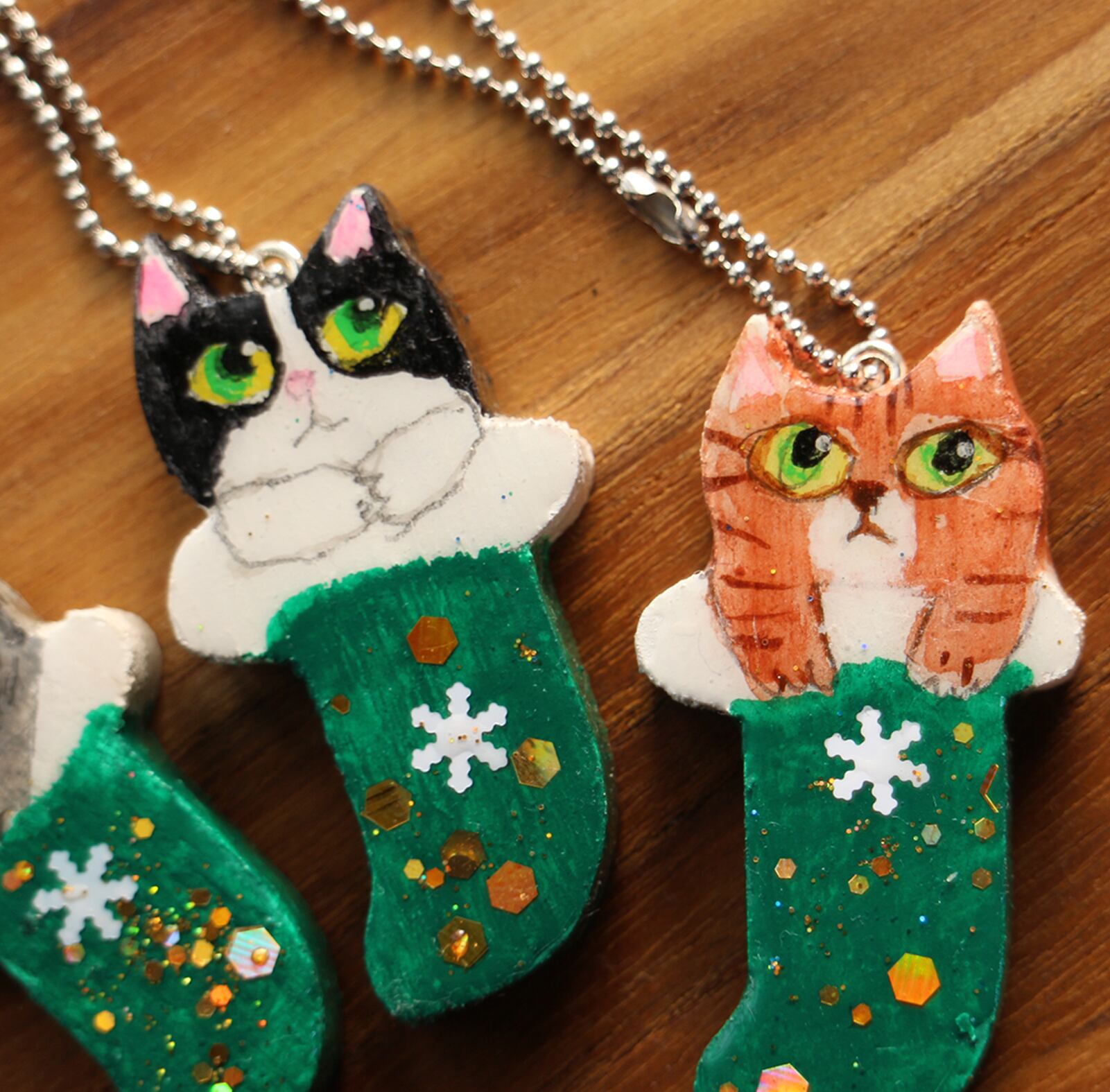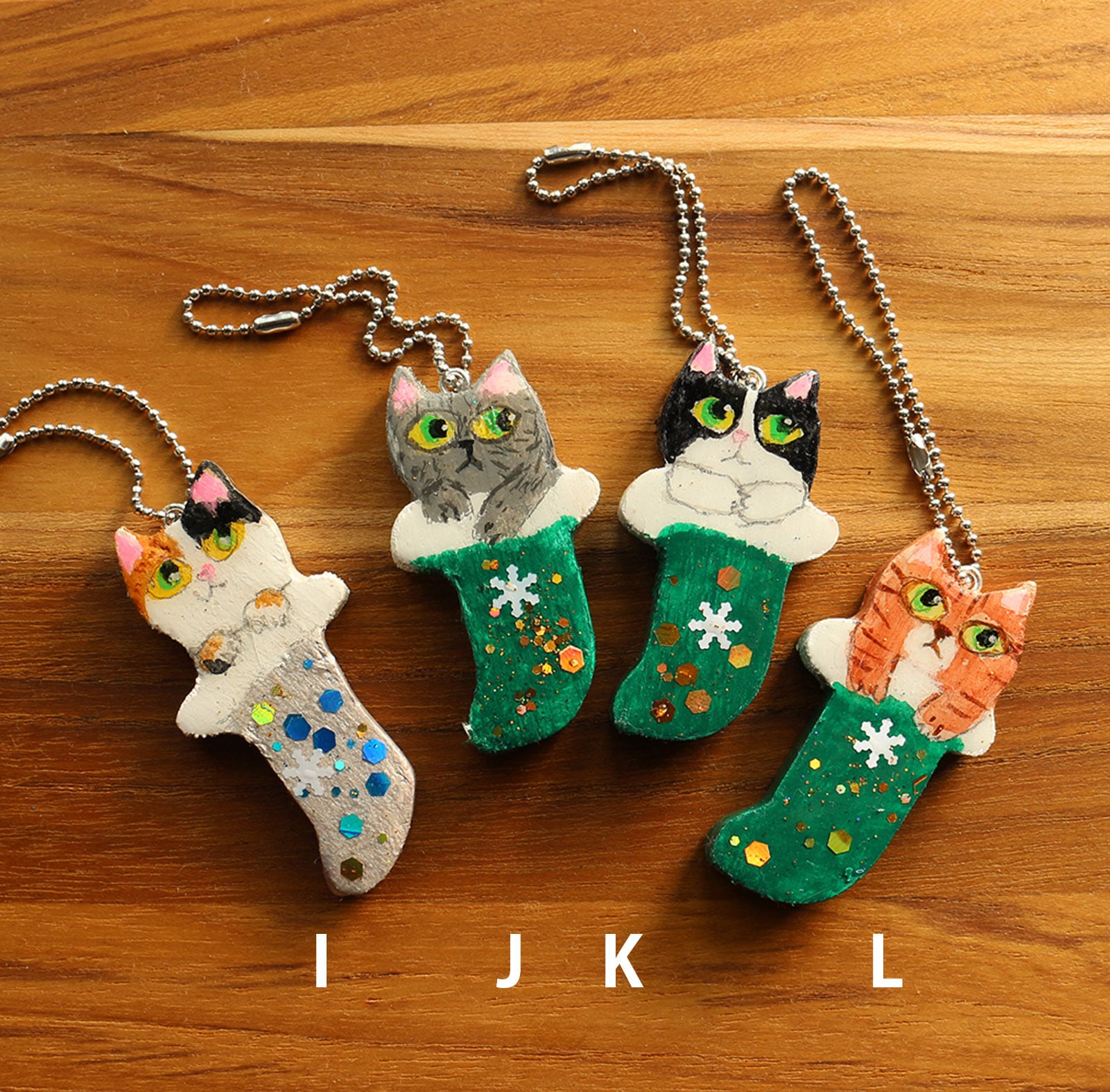 緑・銀色の靴下にはいっている猫ちゃんです。それぞれ手書きで描いています。クリスマスツリーのオーナメント用に、またはチャームにしたり、別途オプションの星形キーホルダーも追加していただけます。