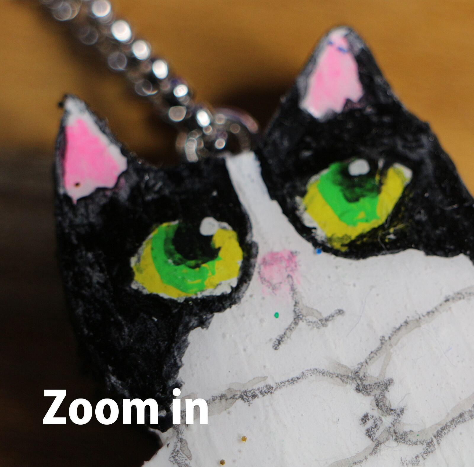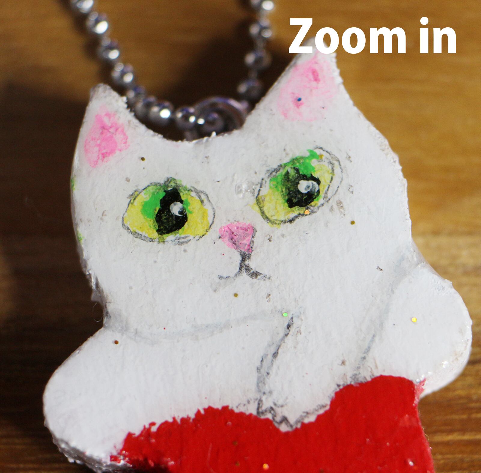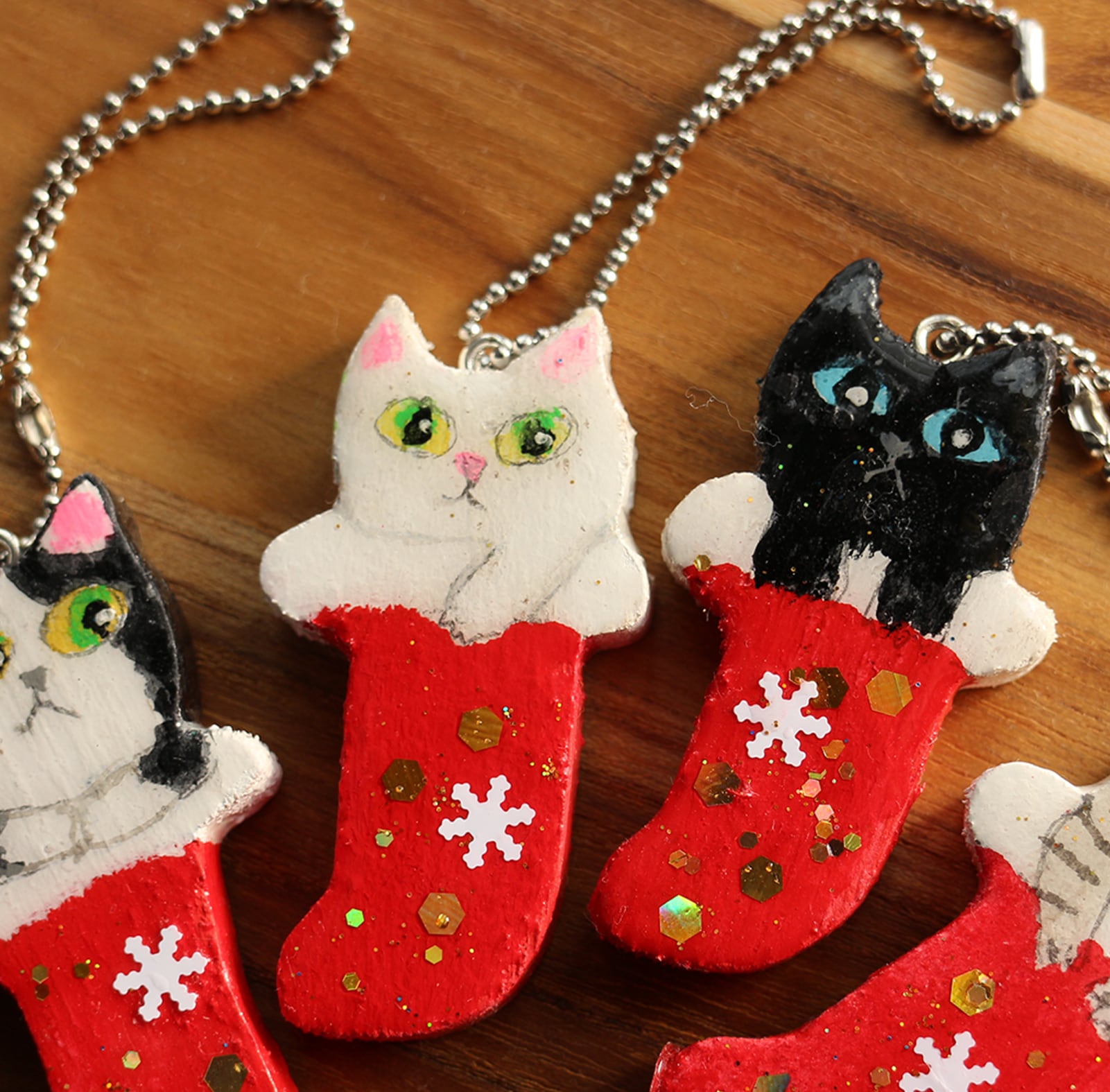 赤いの靴下にはいっている猫ちゃんです。それぞれ手書きで描いています。クリスマスツリーのオーナメント用に、またはチャームにしたり、別途オプションの星形キーホルダー マグネット ブローチピンを追加していただけます。