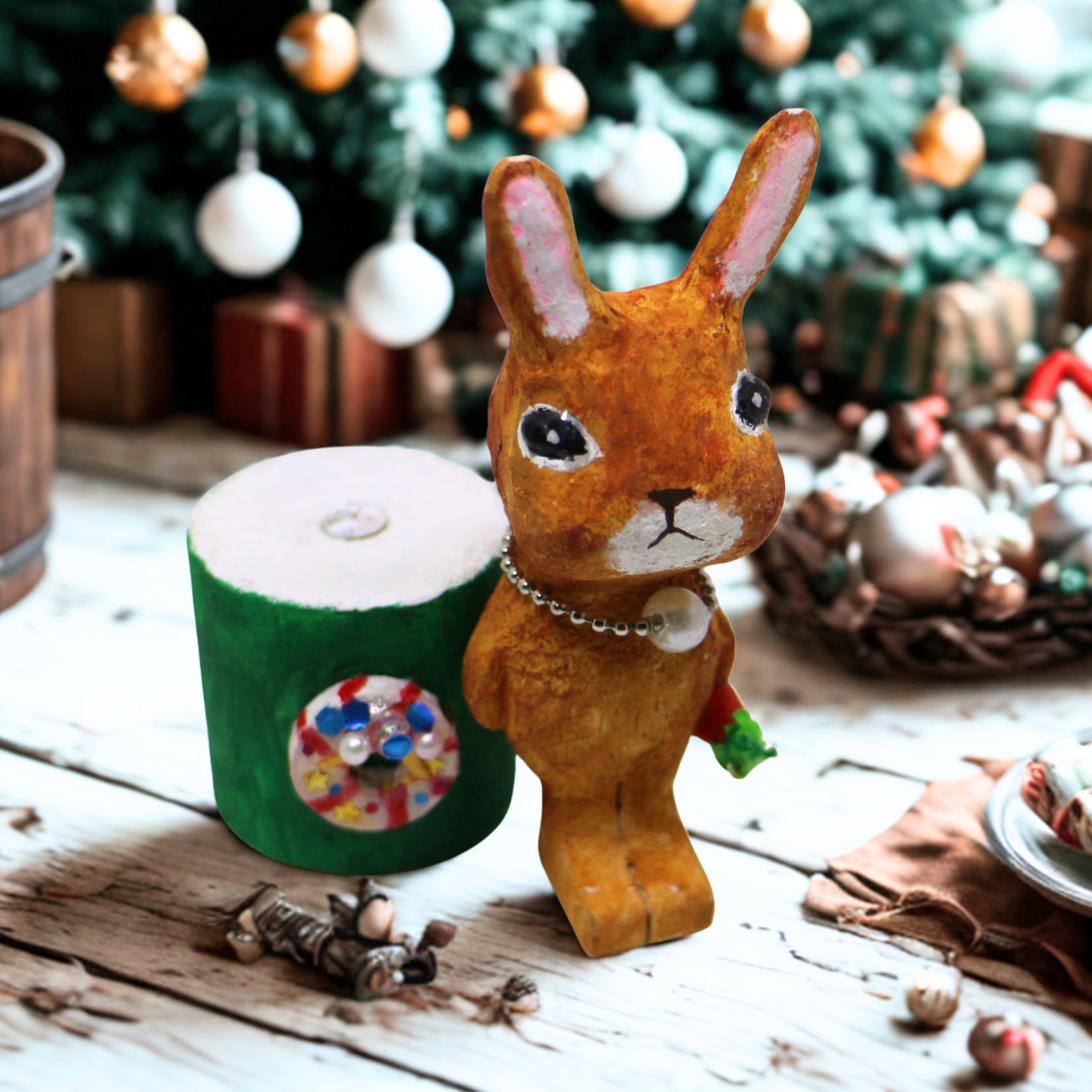 クリスマスバージョンで小さなリースがついた台がおまけでつきます。大好きなキャロットを手にもっています。